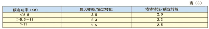 1.9、基準工作制時,YZ系列電動機在額定電壓下的較大轉矩和堵轉轉矩對額定轉矩之比的保證值見表3